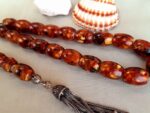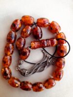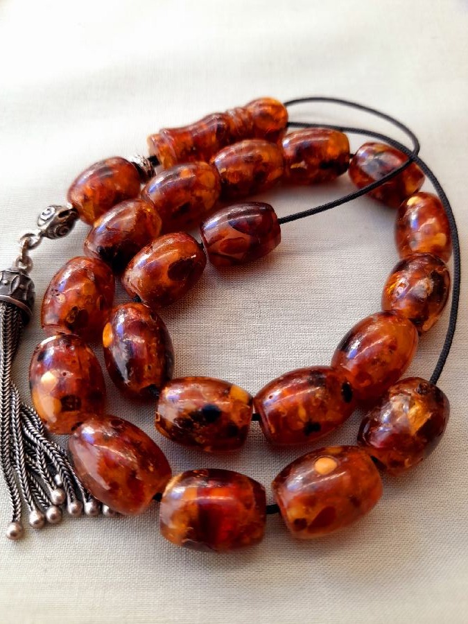 Κομπολόι από πρεσαριστό κεχριμπάρι με ασημένια φούντα και 21 χάντρες.   Βάρος (μαζί με φούντα): 23grΜήκος χάντρας: 11mm Πλάτος χάντρας: 10mmΜήκος κομπολογιού (με