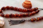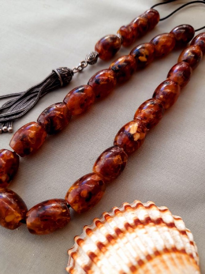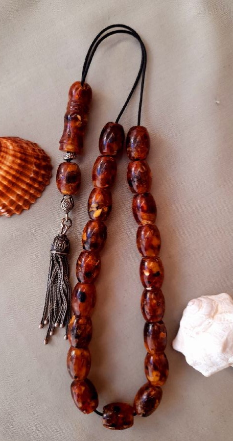 Κομπολόι από πρεσαριστό κεχριμπάρι με ασημένια φούντα και 21 χάντρες.  Βάρος (με τη φούντα): 30grΜήκος χάντρας: 14mm Πλάτος χάντρας: 10mm  Μήκος κομπολογιού