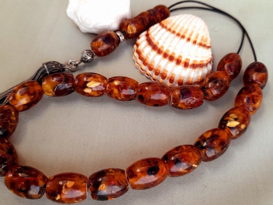 Κεχριμπάρι Ρωσίας με ασημένια φούντα. Συνολικό μήκος : 33cm (μαζί με τη φούντα) Βάρος : 32g Πλάτος χαντρών : 15mm
