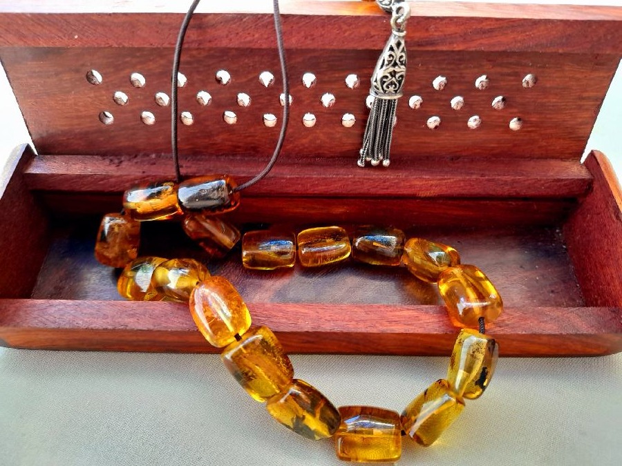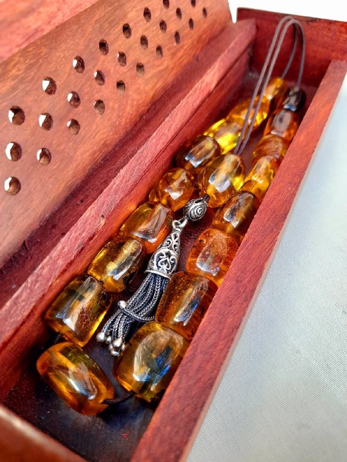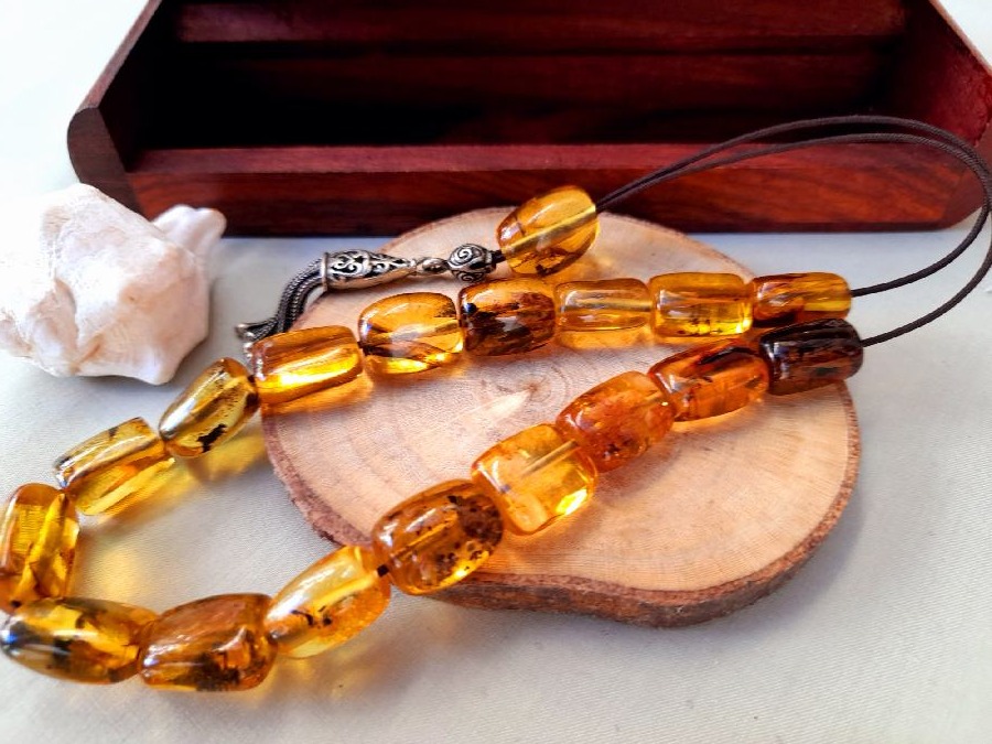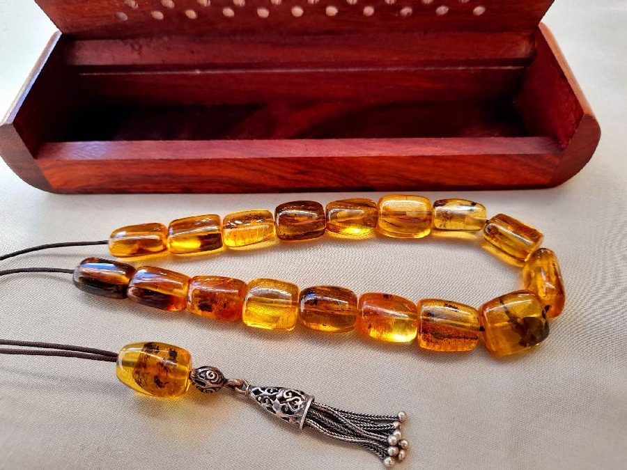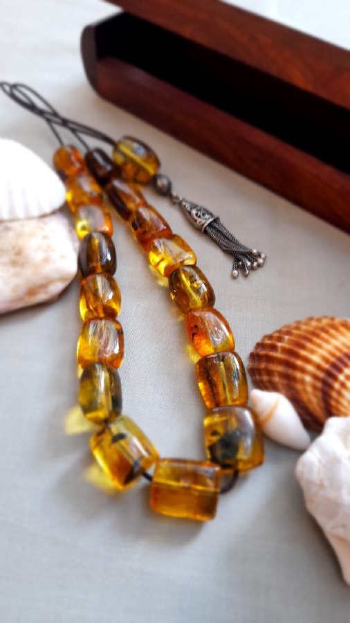 Κομπολόι από πρεσαριστό κεχριμπάρι με ασημένια φούντα και 21 χάντρες.   Βάρος (μαζί με φούντα): 23grΜήκος χάντρας: 11mm Πλάτος χάντρας: 10mmΜήκος κομπολογιού (με