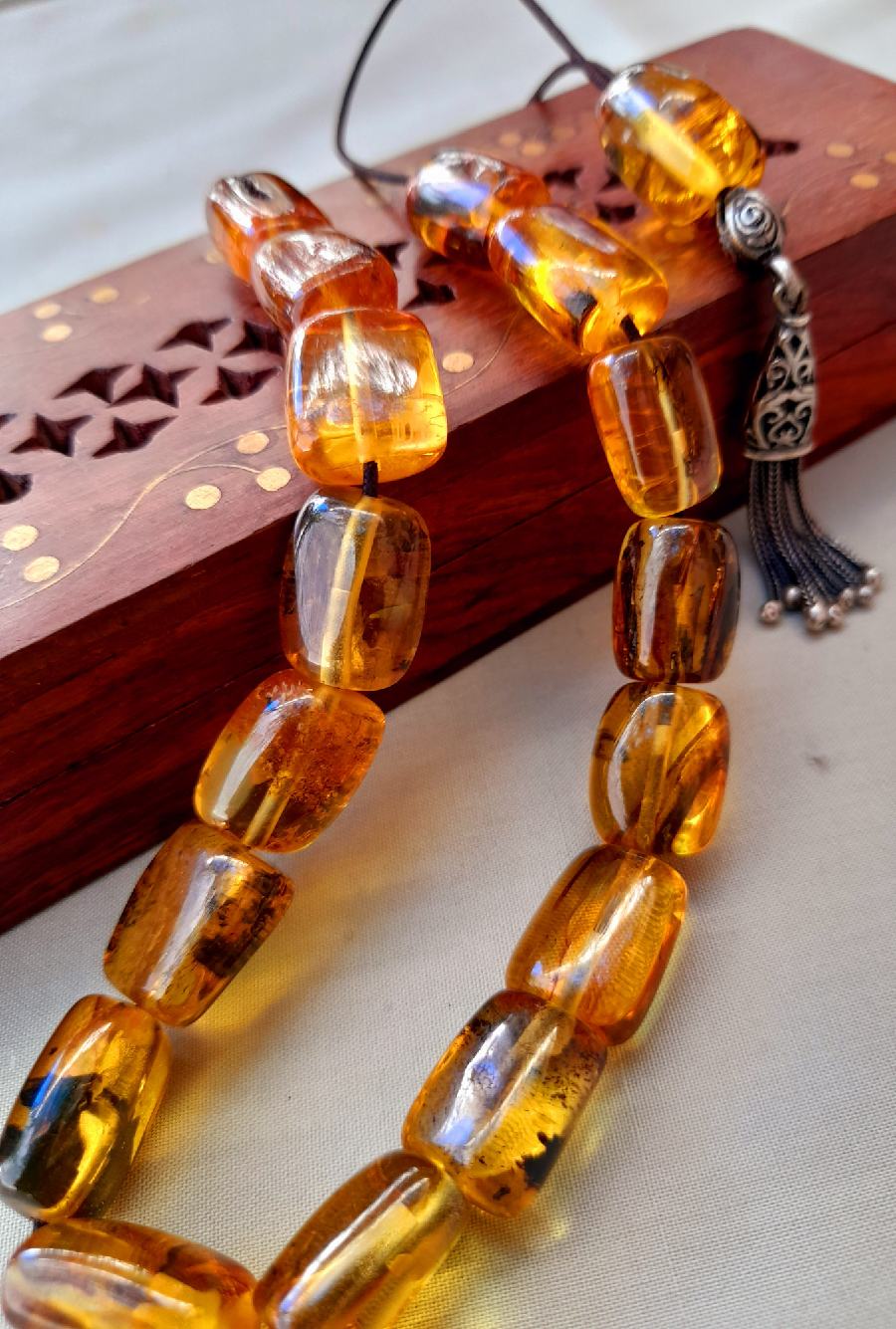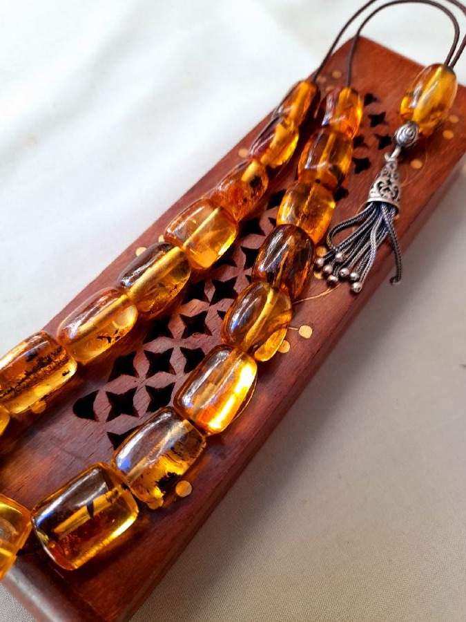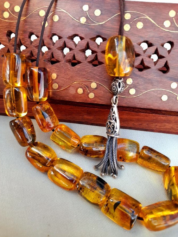 Κεχριμπάρι πρεσαριστό με ασημένια φούντα. Συνολικό μήκος : 38cm (μαζί με τη φούντα) Βάρος : 40g Πλάτος χαντρών : 12mm
