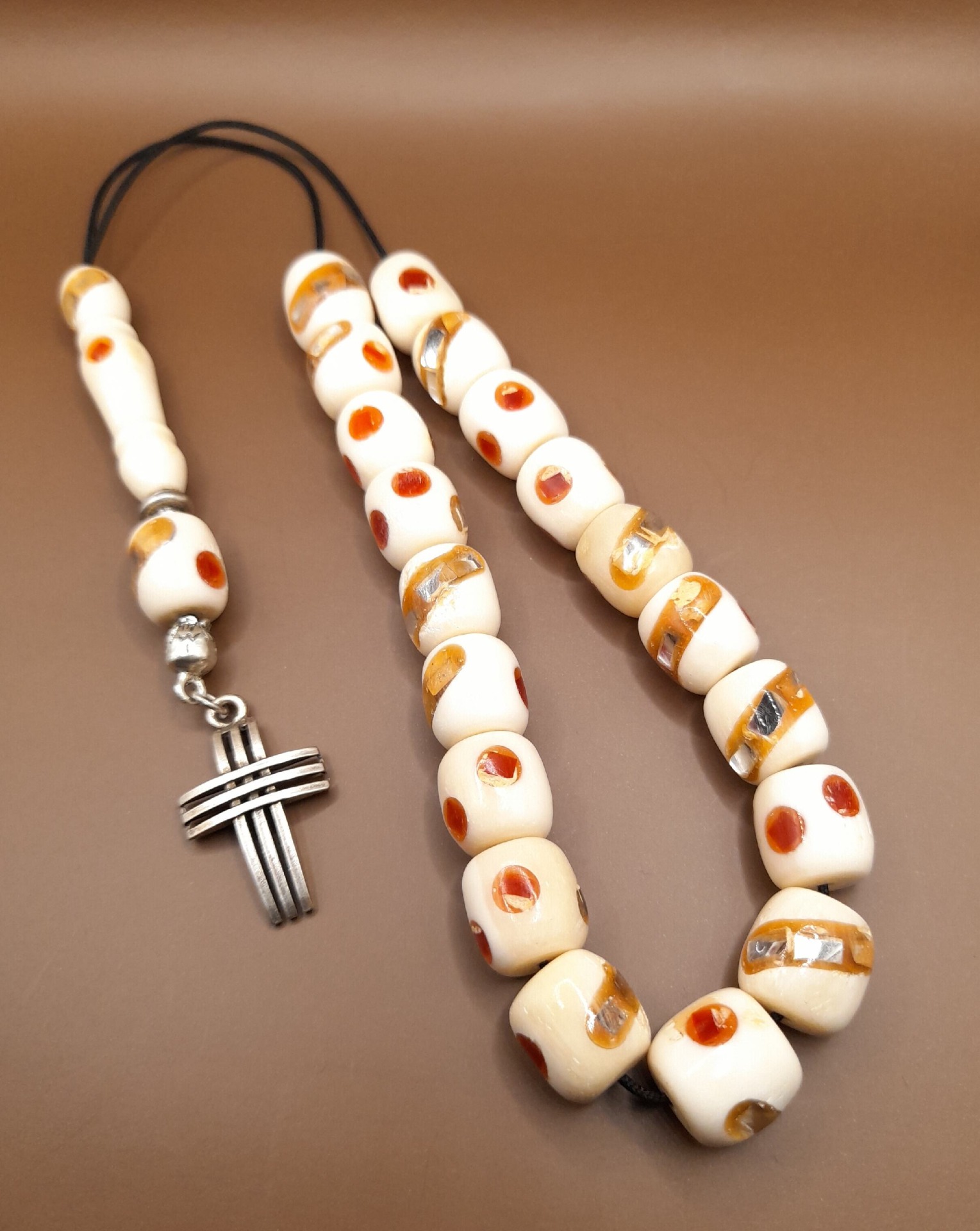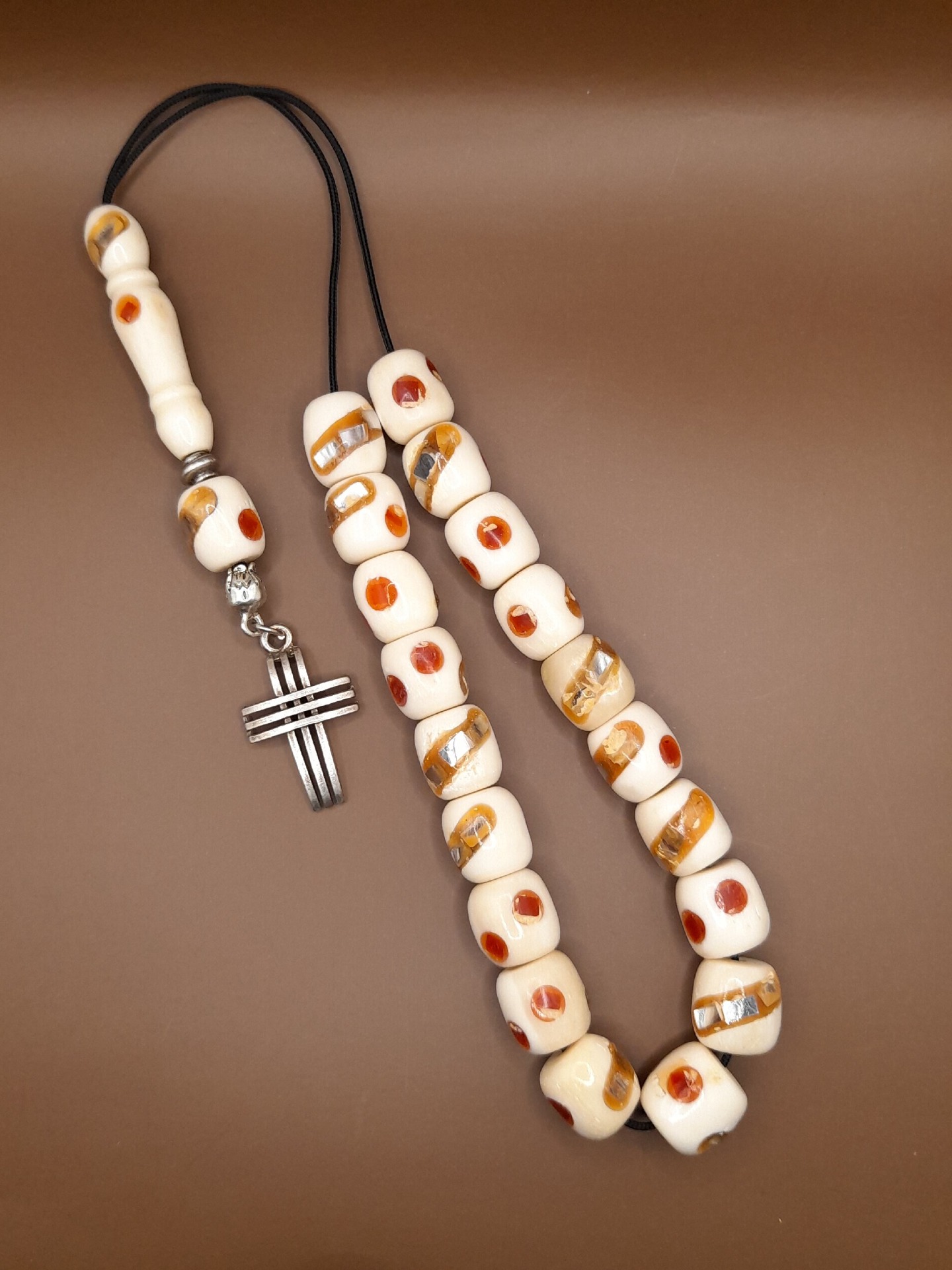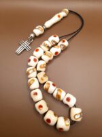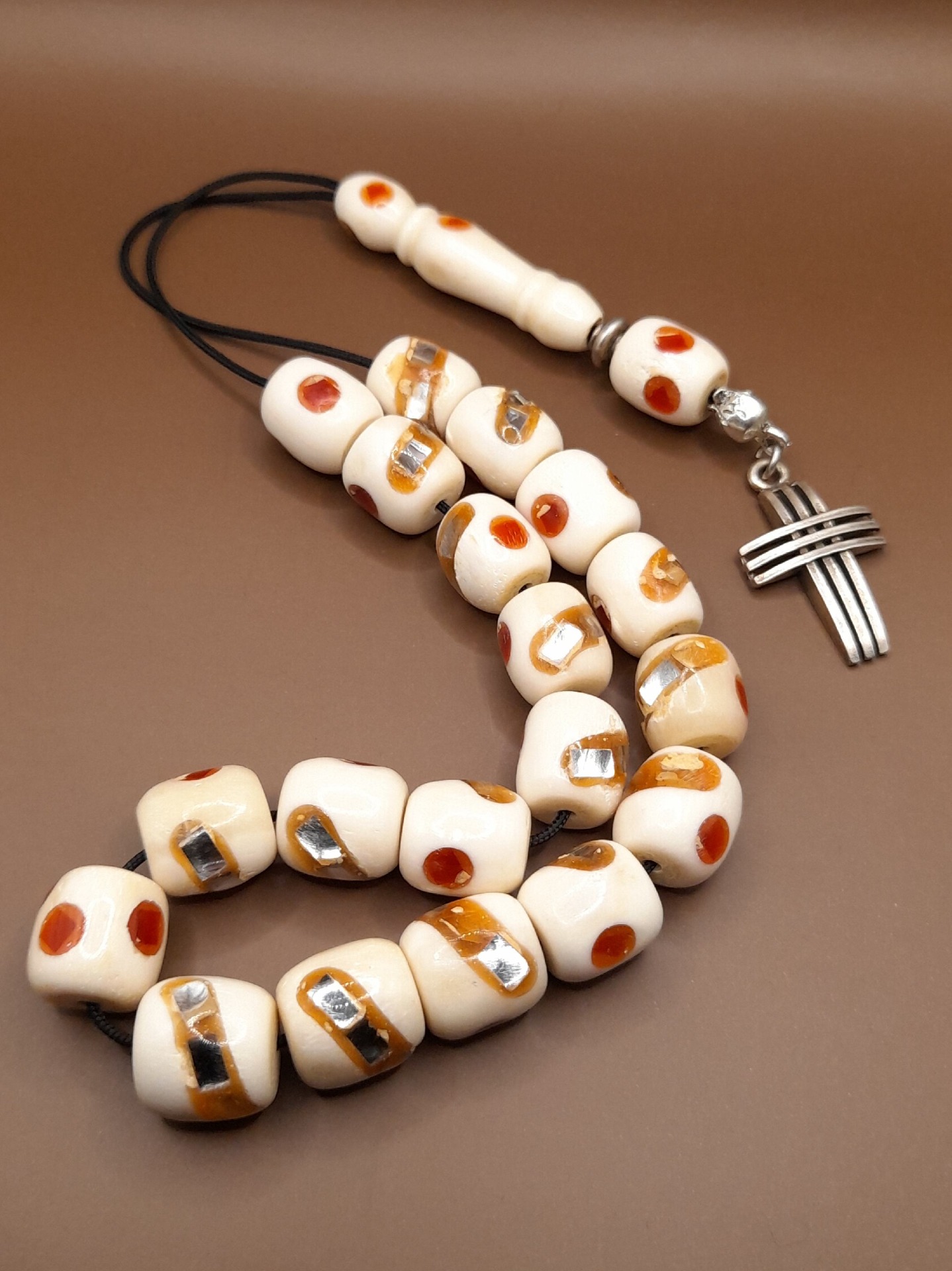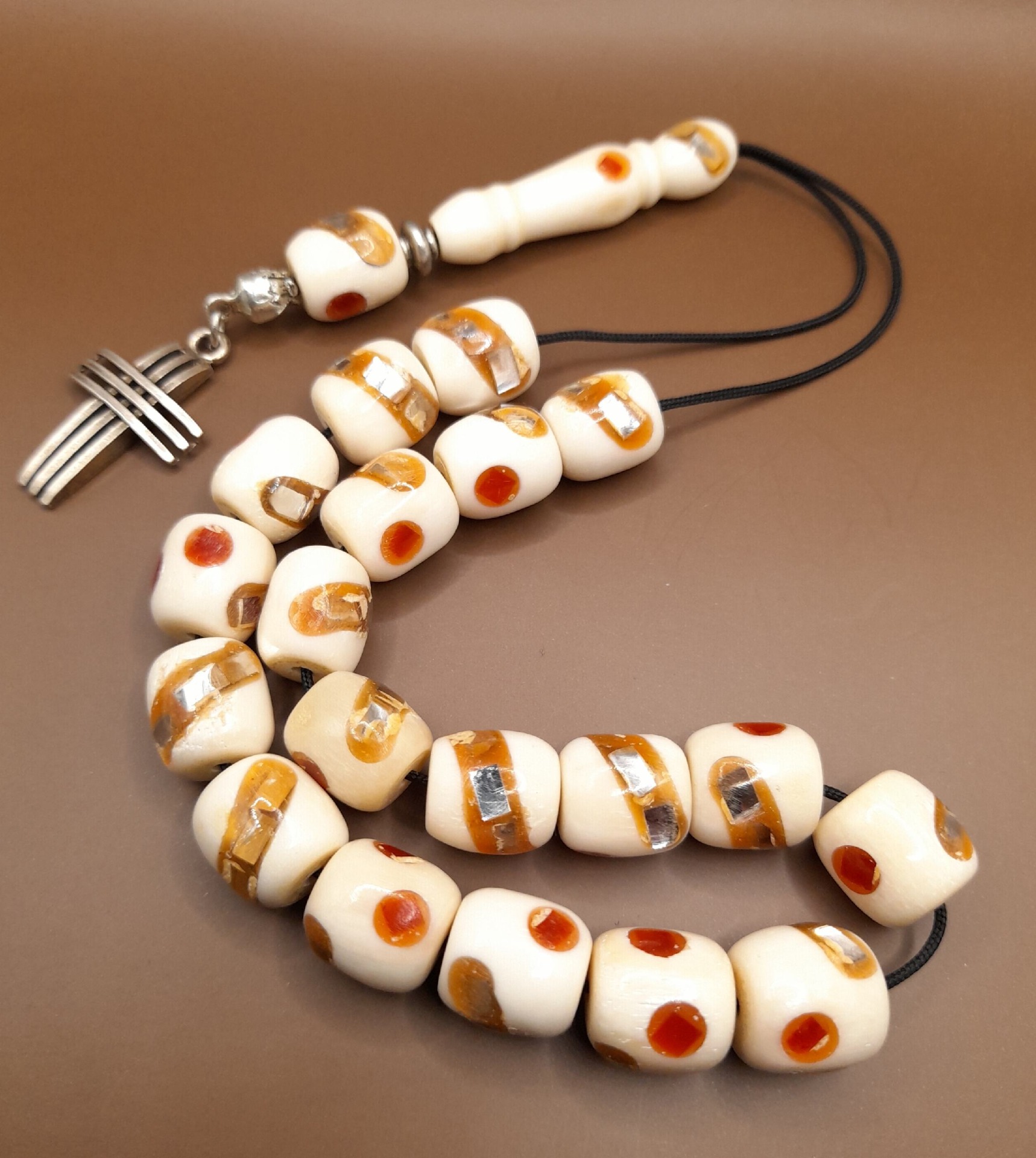 Κόκκαλο καμήλας με χειροποίητα διακοσμητικά σχέδια με 21 χάντρες Βάρος: 42g (με τη φούντα)Μήκος: 30cm (χωρίς τη φούντα)Πάχος χάντρας: 11mmΥψος