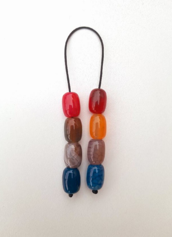 Μπεγλέρι από χρωματιστές ρητίνες. Συνολικό μήκος: 21cm (με όλο το σχοινάκι) Βάρος: 15g Πάχος χαντρών: 14mm, 14mm, 14mm, 12mm Υψος