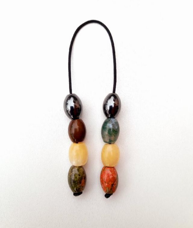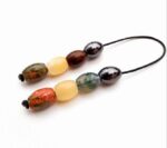 Μπεγλέρι από χρωματιστές ρητίνες. Συνολικό μήκος: 22cm (με όλο το σχοινάκι) Βάρος: 19g Πάχος χαντρών: 17mm, 14mm, 14mm, 13mm  Υψος