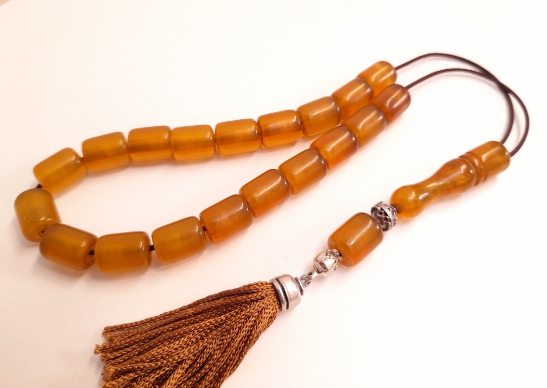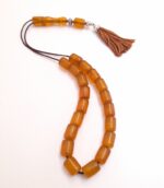Ρητίνη με 33 χάντρες* Βάρος: 63g (με τη φούντα)Μήκος: 36cm (χωρίς τη φούντα)Πάχος χάντρας: 13mmΥψος χάντρας: 12mm *Με σκόνη κεχριμπαριού