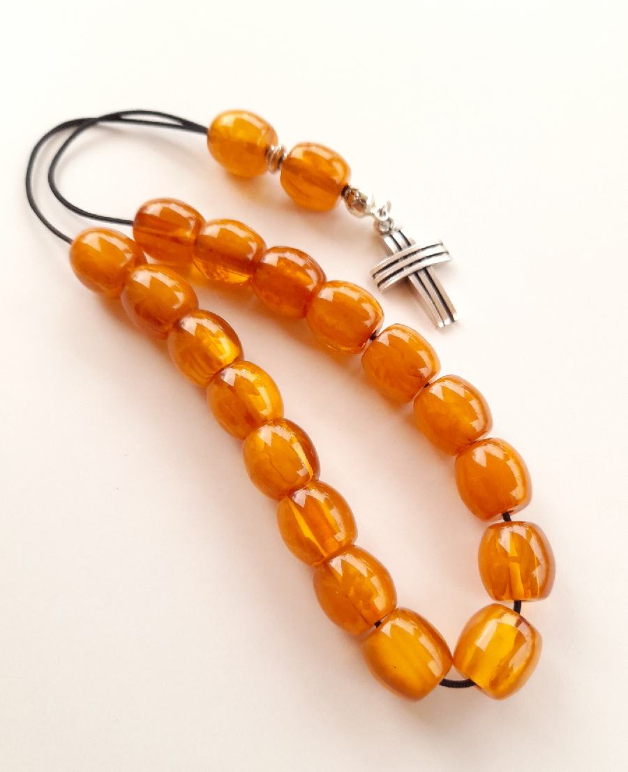 Ρητίνη με 33 χάντρες* Βάρος: 60g (με τη φούντα)Μήκος: 35cm (χωρίς τη φούντα)Πάχος χάντρας: 13mmΥψος χάντρας: 12mm *Με σκόνη κεχριμπαριού